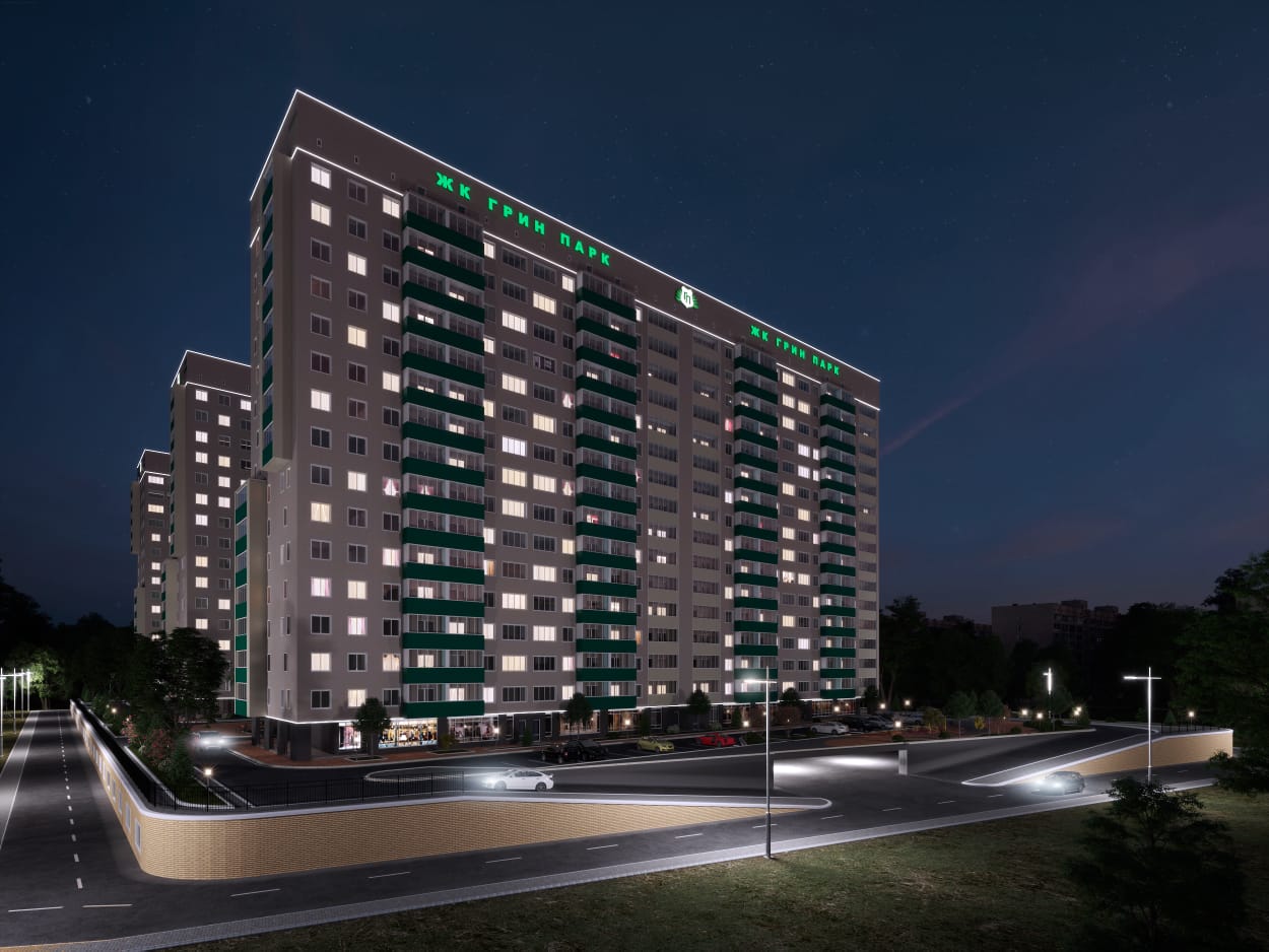 В комплексе «Грин Парк» три высотных семнадцатиэтажных дома, расположенные на стилобате, в котором расположены крытые парковки и помещения коммерческого назначения. Сверху на крыше стилобата проведено озеленение территории и смонтированы детские площадки, спортивные тренажеры организованы парковочные карманы для стоянки автомобилей. Во дворе проведено четкое зонирование, чтобы жители объединялись по интересам и не мешали друг другу. Для удобства организованы прогулочные зоны и даже площадка для приготовления шашлыка.
